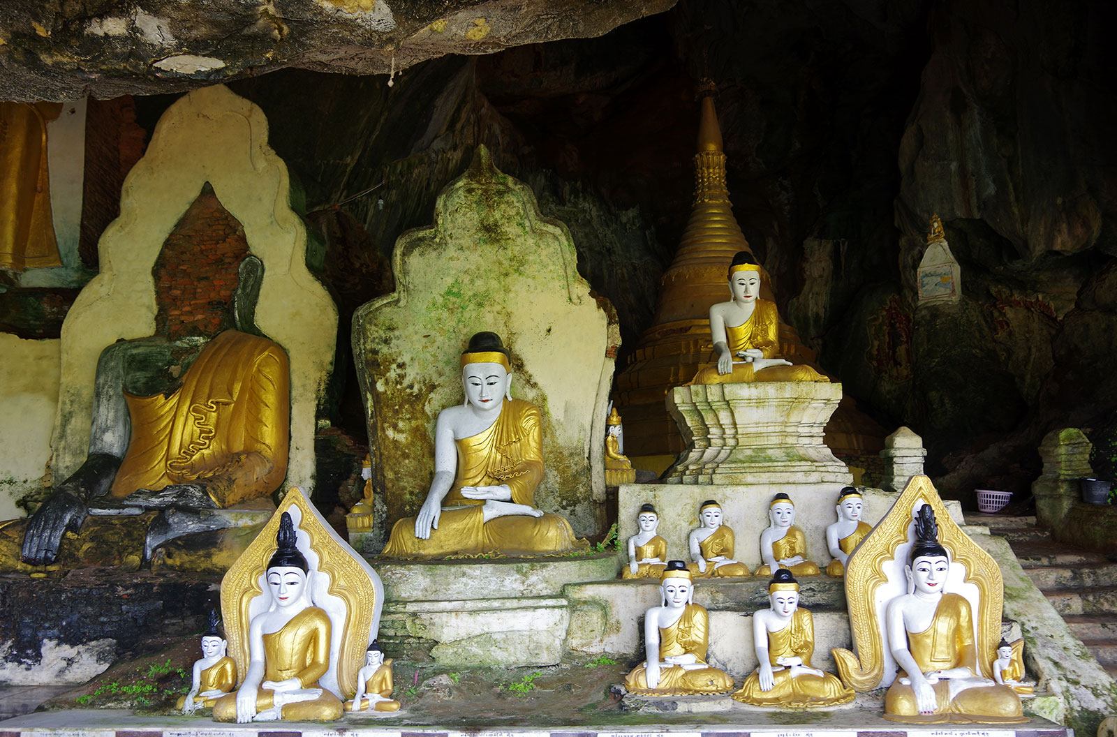 On repart ensuite pour Kaw Ka Thaung Cave, une autre grotte beaucoup plus petite. On retient la rangée de statues de moines qui mènent à des bassins où la population locale se baigne.